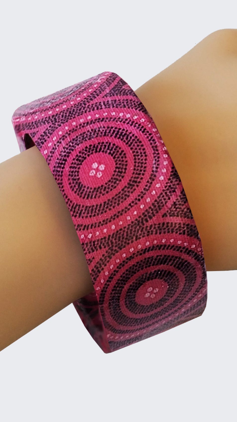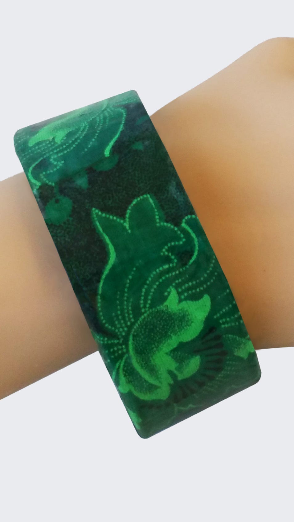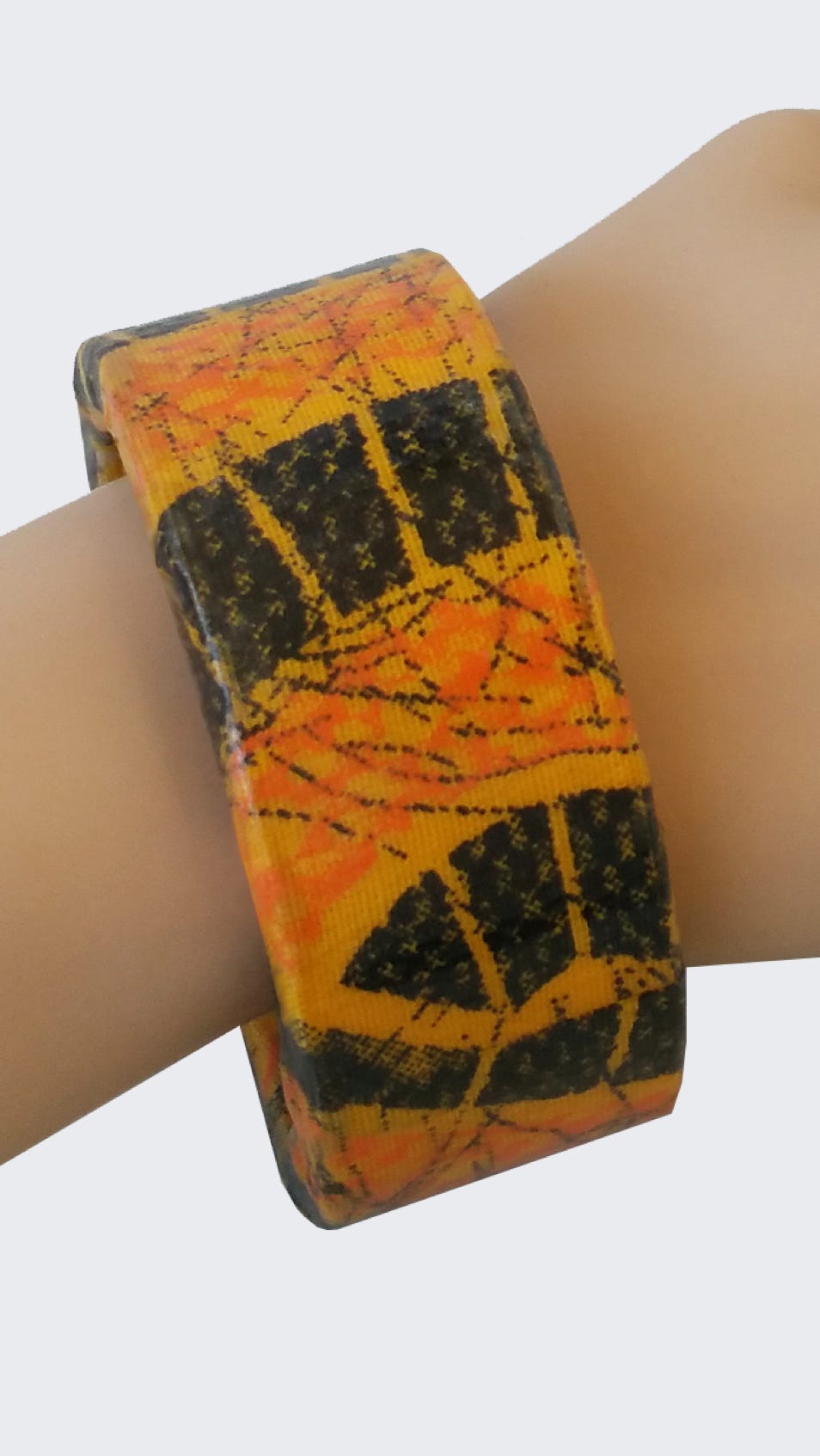 "These Bangle Bracelets are made of a light weight Wood and because they are handcrafted, there is slight variations in size. They are covered in Fabric, then sealed with an Acrylic Overcoat. When you order your bracelet from these pictures, they represent the Color you will be getting. However Patterns may vary slightly due to discontinued supply or new stock variations. "