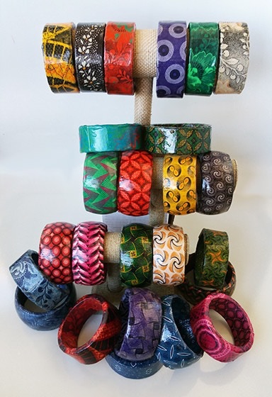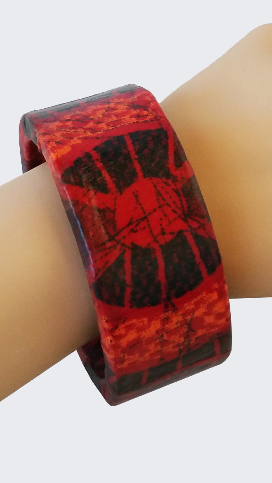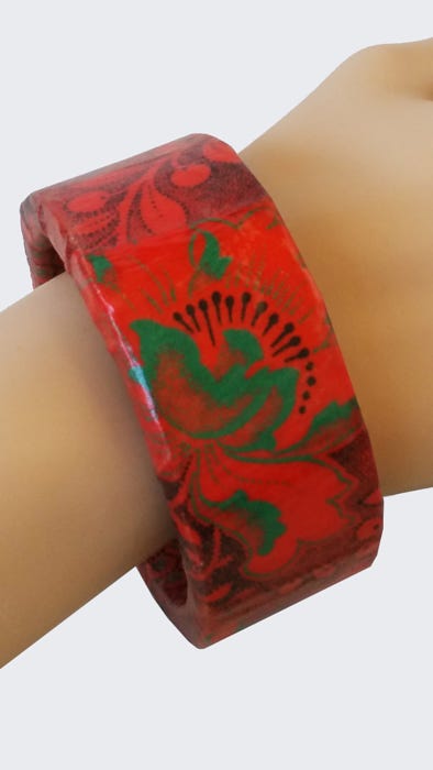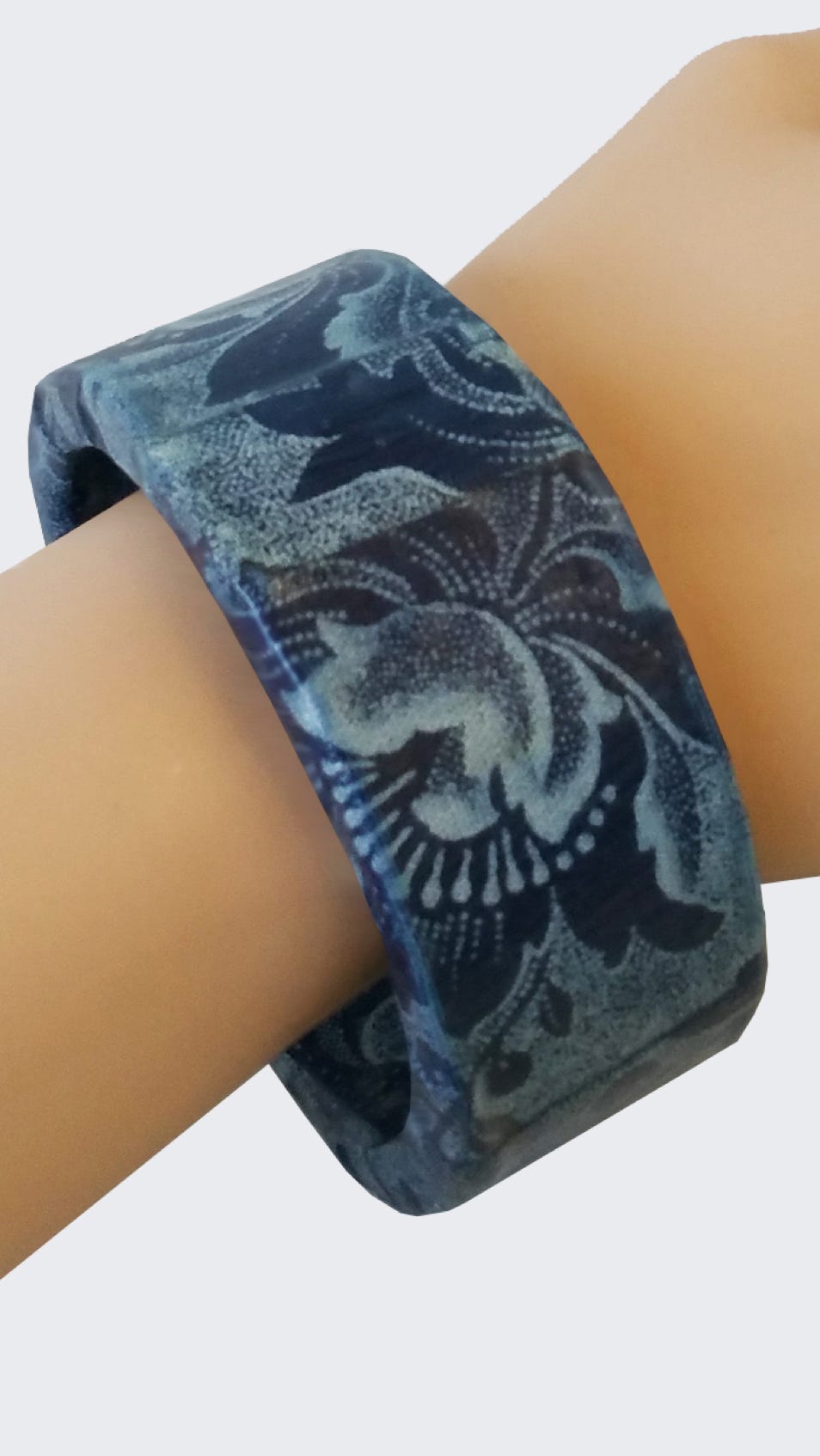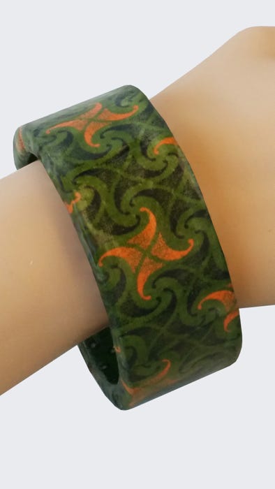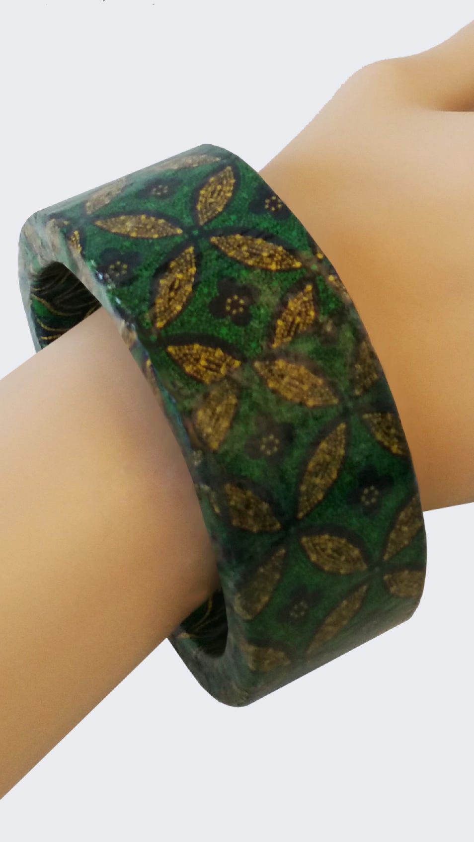 "These Bangle Bracelets are made of a light weight Wood and because they are handcrafted, there is slight variations in size. They are covered in Fabric, then sealed with an Acrylic Overcoat. When you order your bracelet from these pictures, they represent the Color you will be getting. However Patterns may vary slightly due to discontinued supply or new stock variations. "