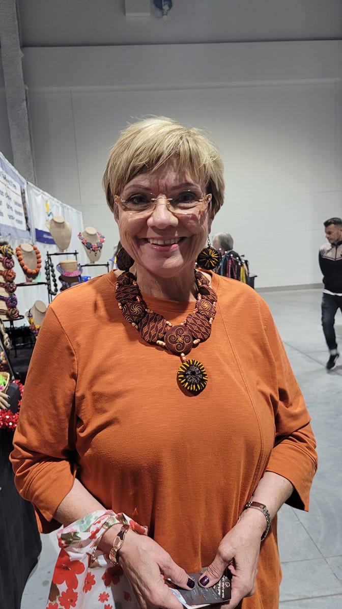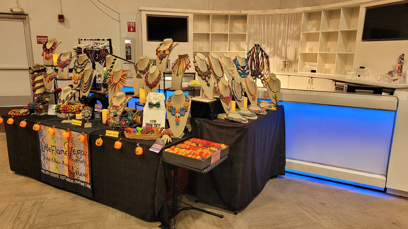 " Every Necklace, or Accessory I offer is Handcrafted from imported South African Fabric. They are all one of a kind.  Because of that, prints on each individual fabric may vary slightly, or a fabric may have been discontinued.  All efforts are taken to insure that you are getting the color scheme in the picture of the product you may be ordering."