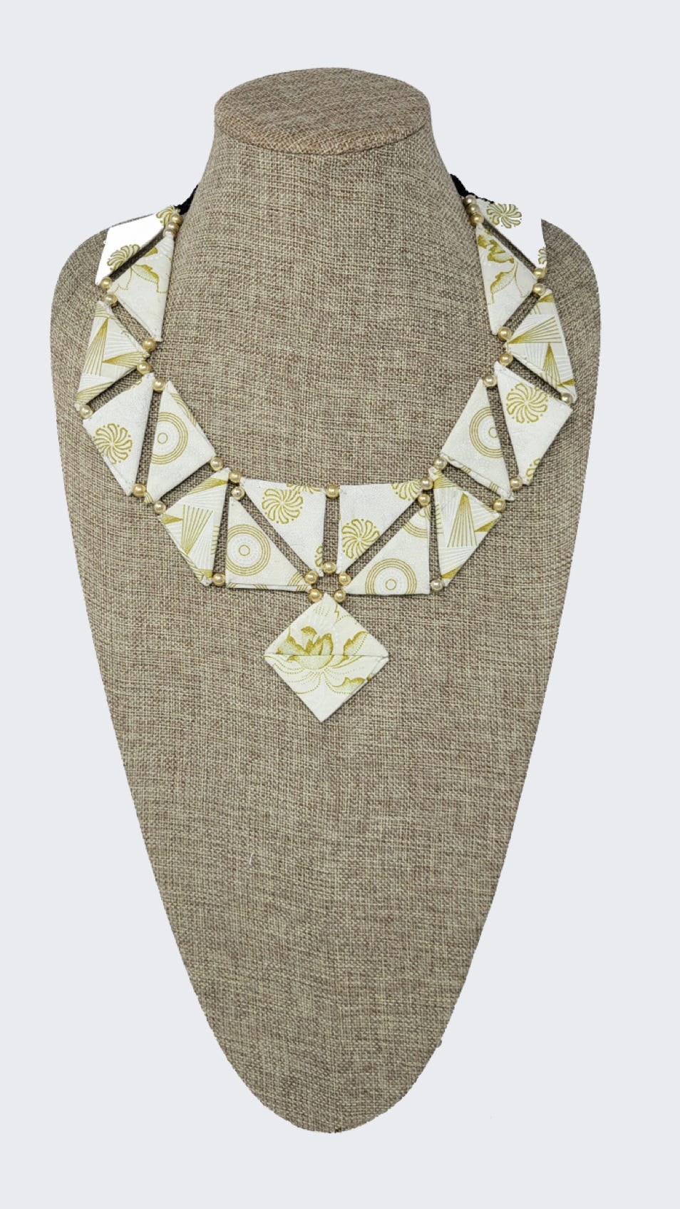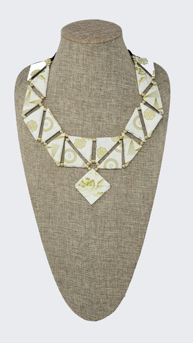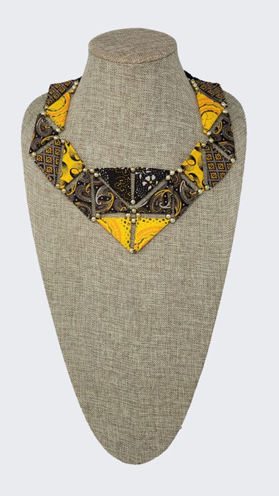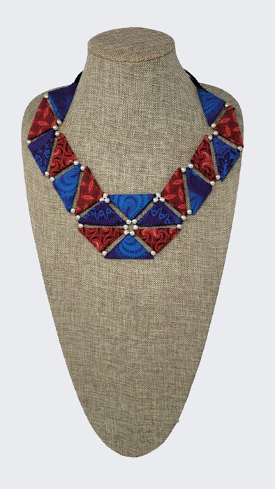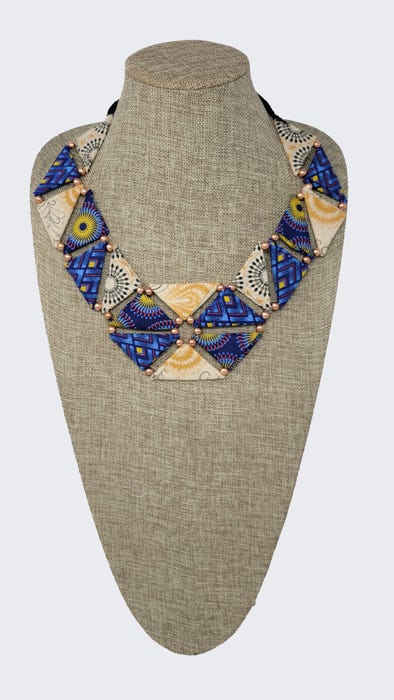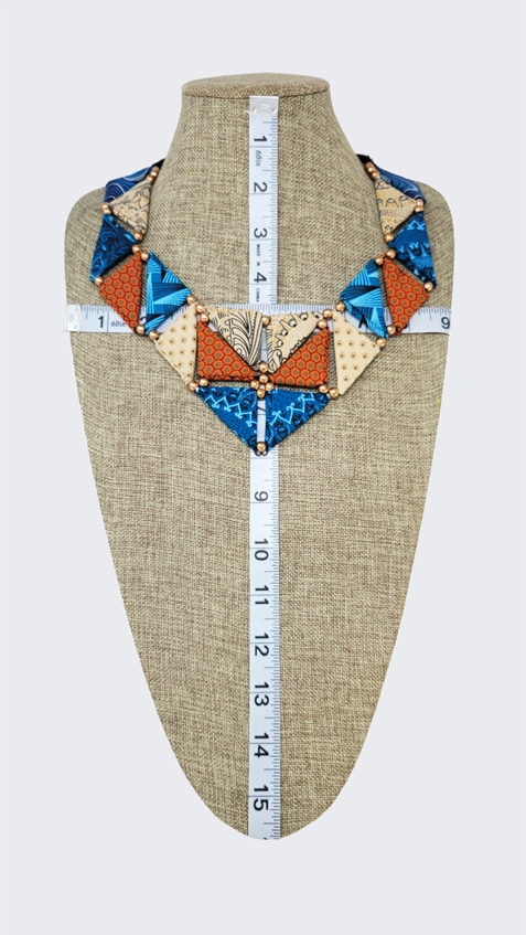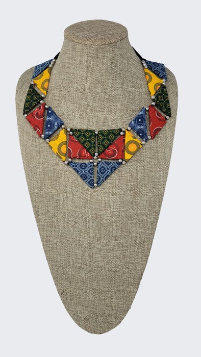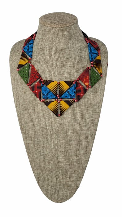 " Every Necklace, or Accessory I offer is Handcrafted from imported South African Fabric. They are all one of a kind.  Because of that, prints on each individual fabric may vary slightly, or a fabric may have been discontinued.  All efforts are taken to insure that you are getting the color scheme in the picture of the product you may be ordering."